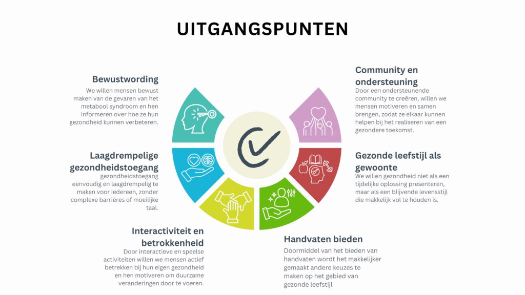 Doelgroep: Volwassenen met het metabool syndroom of verhoogd risico hierop, die kampen met gezondheidsuitdagingen zoals overgewicht, hoge bloeddruk en insulineresistentie. Zij ervaren mentale en sociale barrières om gezonder te leven en missen kennis, motivatie en ondersteuning.